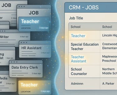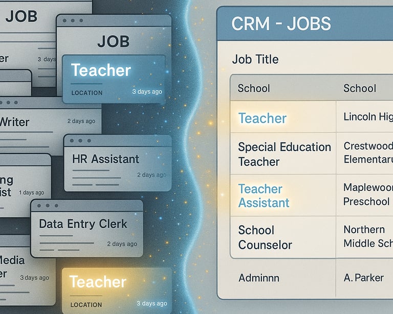 From customized CV analyzers to CRM-integrated job-scanners, our purpose-built AI workflows are designed specifically for education recruitment agencies. Our tailor-made automations handle the time-consuming tasks that keep you from what matters most: building relationships with schools, supporting teachers through career transitions, and ensuring every placement is the right fit for both candidate and classroom.